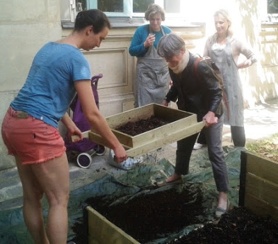 Ce samedi nous avons accueilli les Composteurs de Quartier qui n'avaient pas encore eu la possibilité de récupérer du compost mûr . Au menu : tamisage à 4 mains et dégustation de sirop de fleurs de sureau maison. Le premier compost de quartier parisien, aprés 7 mois de fonctionnement a complètement validé la pertinence de cette échelle de compostage complémentaire du compostage en pied d'immeubles. De nombreux autres projets démarrent dans le 14ème, 13ème, ...